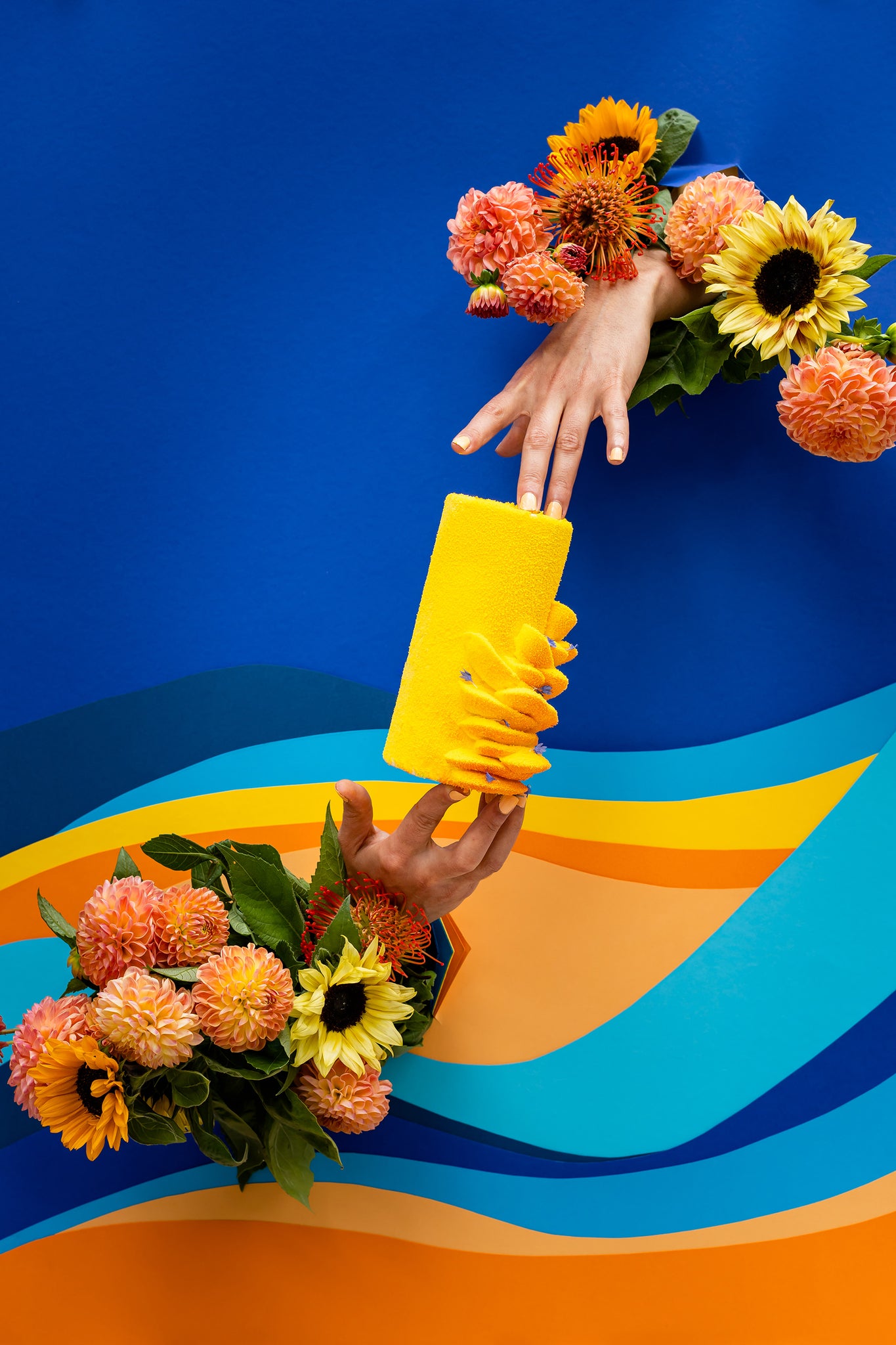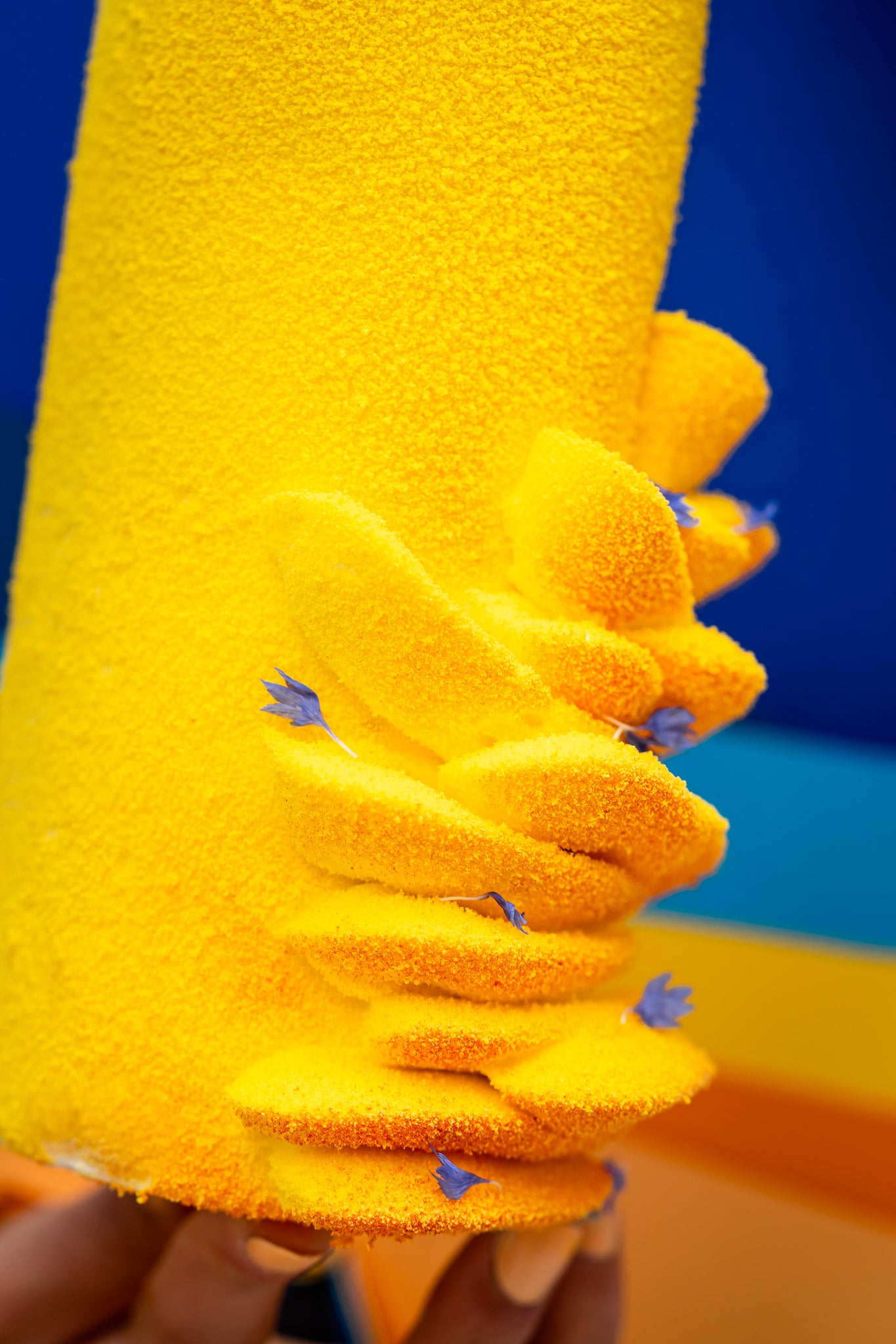 La bûche est finalisée par un travail minutieux de pochage, pour une finition élégante et tout en relief, puis sublimée d’un pistolage velours prêt à l’emploi (SANS GLUTEN)