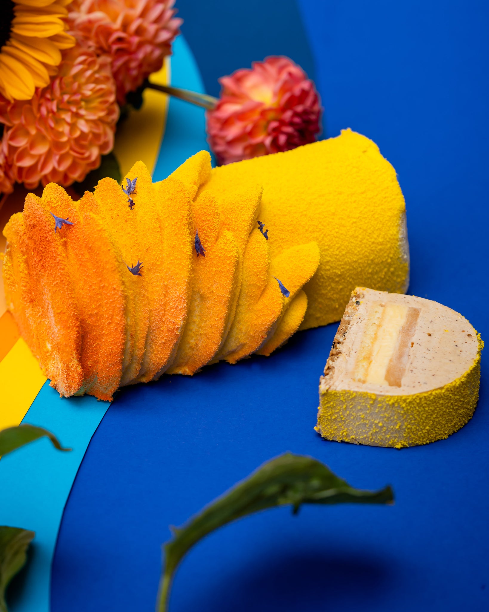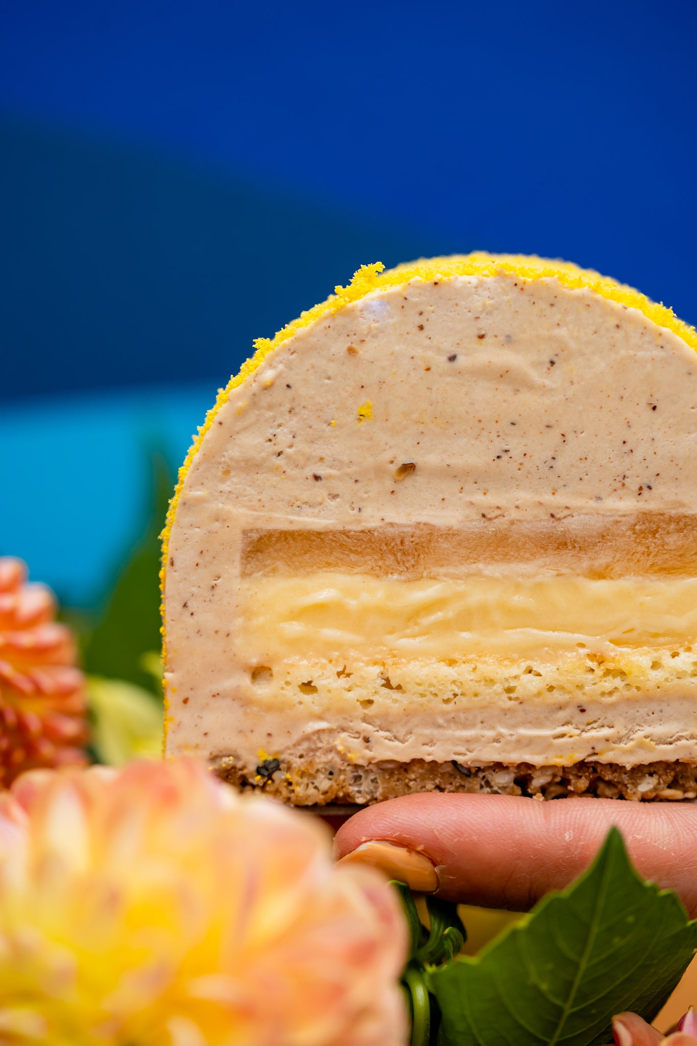 Au programme, la bûche "Pomelo" : une création tout en équilibre entre douceur et fraîcheur. Sous sa mousse praliné délicatement fondante se cache un curd au kalamansi, vif et ensoleillé, accompagné d’un gélifié pamplemousse à la pointe d’amertume. Le tout repose sur un croustillant sésame noir, à la fois intense et légèrement torréfié.